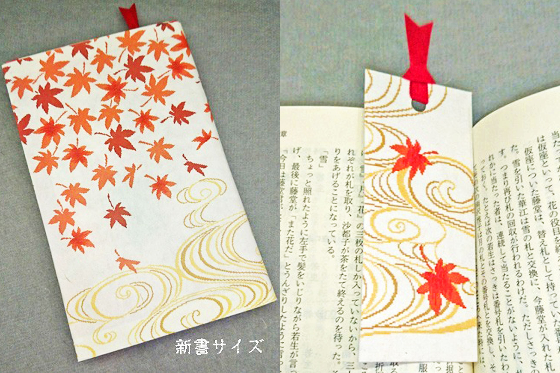 因州手漉き和紙を使用した、白地に流水赤紅葉の新書サイズブックカバーです。