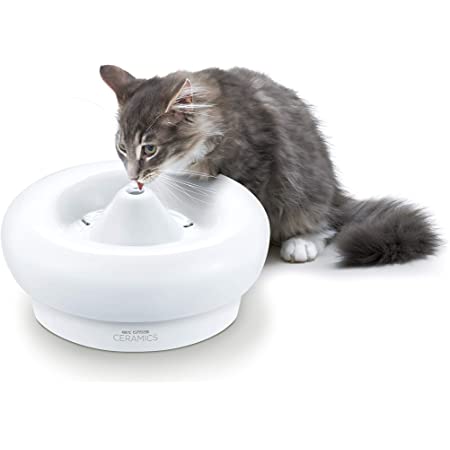 商品紹介ワンランク上の「キレイ」な水を! ピュアクリスタルCERAMICS -セラミックス-は陶器製の飲み口なので、金属やプラスチックのアレルギーがあるネコちゃんでも安心してご使用いただけます。中心部から穏やかに溢れた水流で、食べカスや被毛等を飲み口から下部タンクへ流すので、飲み口は常にキレイな状態を保て、飲みやすさを追求したセラミック製循環式給水器。飲み口が広く、外観からはフィルターやコード・ポンプなどの内部構造が見えないスタイリッシュなデザインです。毎日の水換えやお手入れが必要なベースタンク部分は使いやすさを重視した、軽くて持ち運びのしやすいABS樹脂製です。専用カートリッジでフードカスやホコリ、抜け毛をキャッチし、キレイを維持する抗菌活性炭とピュアナチュラル(高性能活性炭)の2種類の活性炭とイオニック(イオン交換樹脂)が水道水のカルキ臭、マグネシウム、カルシウムをカット。ポンプで水を循環させ、水中に酸素を取り込むのでいつでもおいしい水をネコちゃんに飲ませることができます。獣医師推奨。流れる水にネコちゃんは興味を示し、飲水量アップに貢献します。※弊社顧問獣医師の推奨となります。お水たっぷり 容量1.5リットルいたずらしても安心な12Vの低電圧設計。コードは底部で長さを調節できる収納構造。1日中使用しても電気代は1ヶ月約43円(50Hz/1kWh=25円の場合)定格消費電力:2.4W/2.0W(50/60Hz)電源コード:約1.7m(中間接続部含む)※本体からの長さ交換用フィルターは「ピュアクリスタル軟水化フィルター サークル・ケージ子猫用」が使用できます。